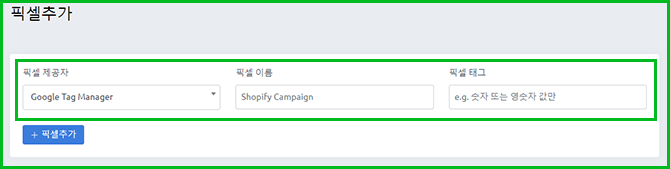픽셀제공자에서 구글이나 페이스북, 트위터등을 선택후 항목을 작성합니다.
